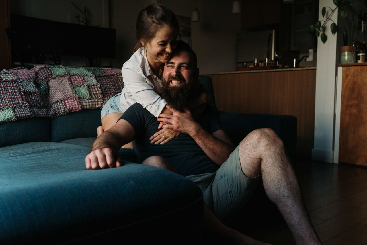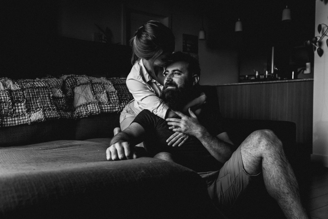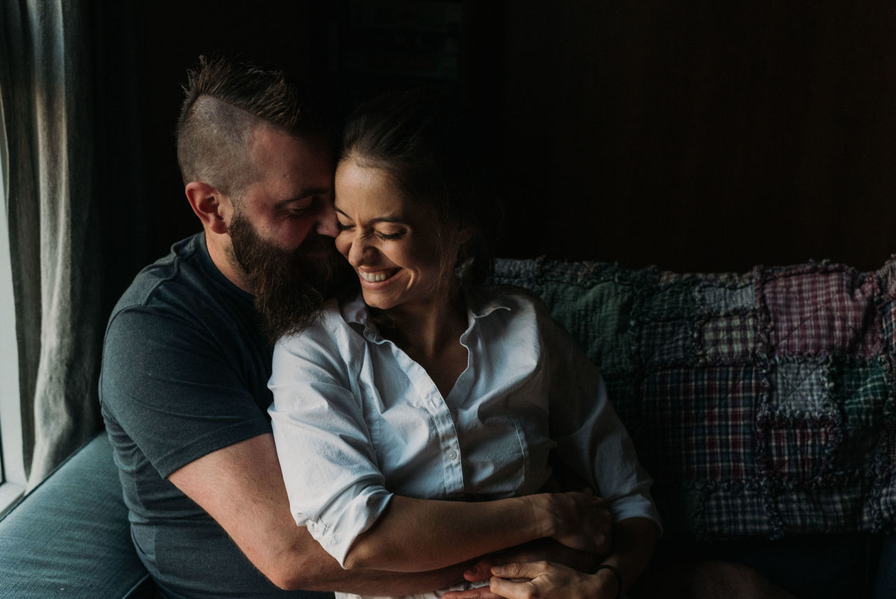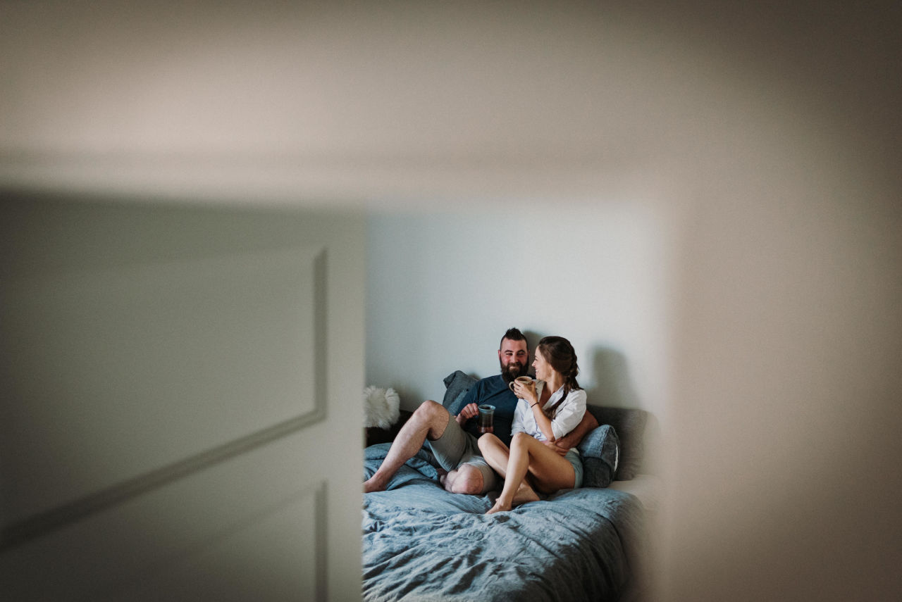 When it came time to plan Dominique & Mike’s engagement session, they suggested doing it at home. This is something we don’t do often as most people chose outdoor settings with nature elements. Home engagement sessions are a fantastic way of personalizing your photos to have more meaning. Doing things you love together in a comfortable setting that brings out who you are together.