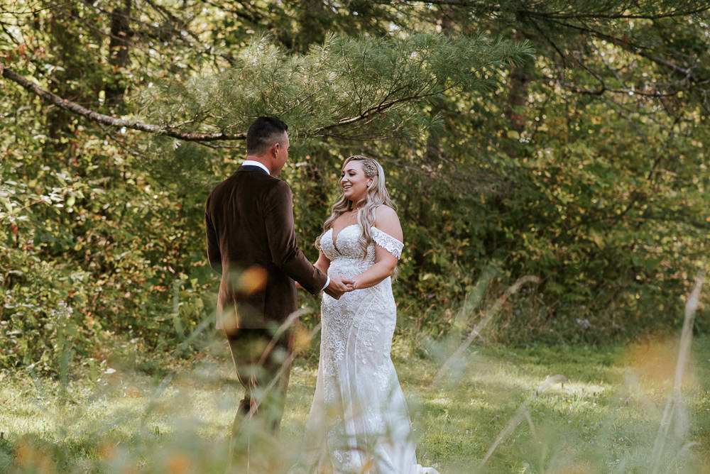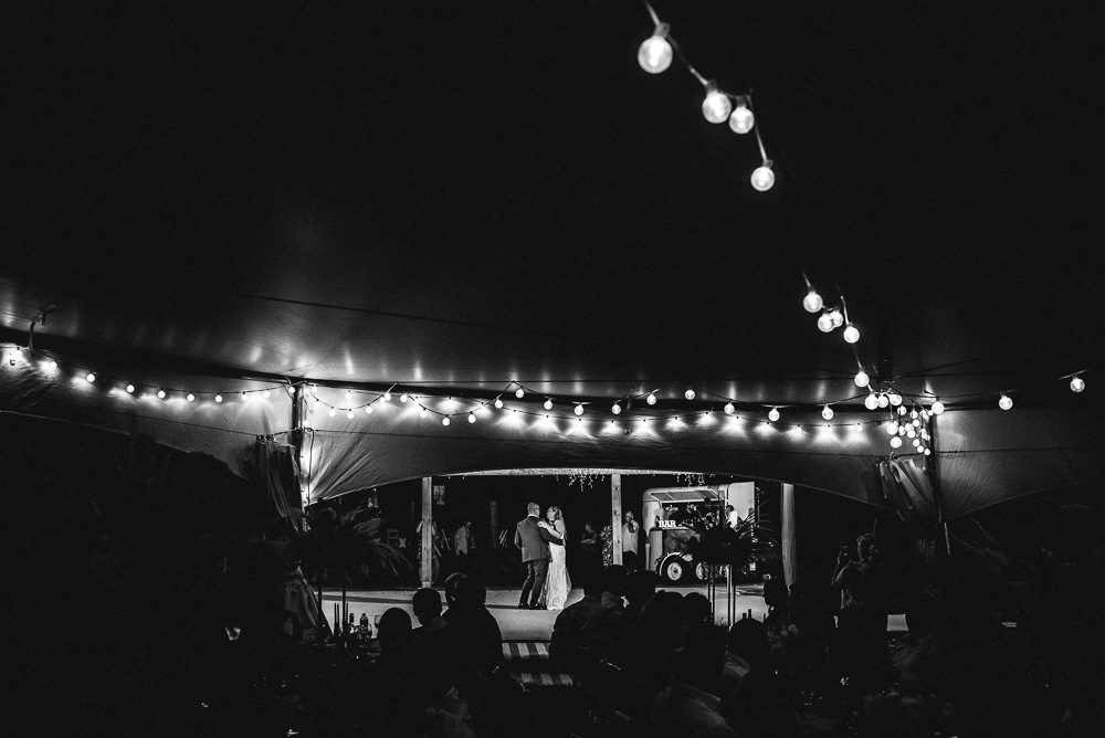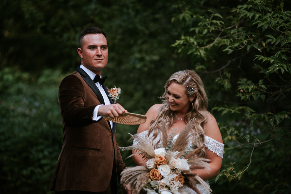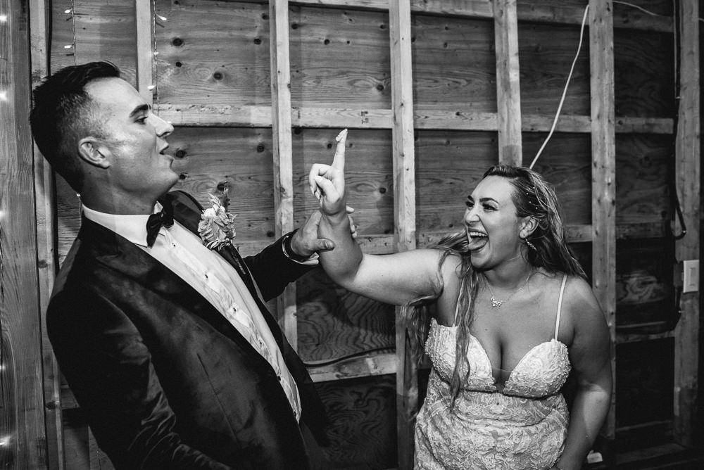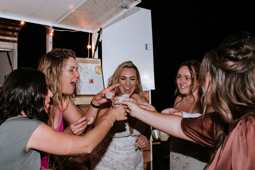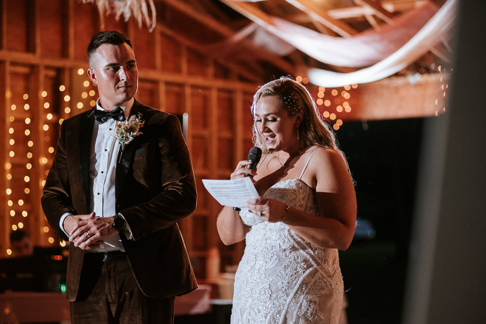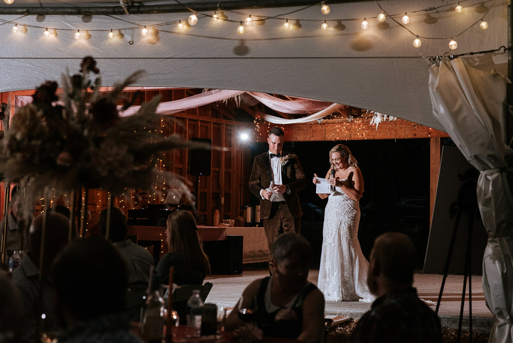 The reception was a celebration of love, laughter, and the joy of togetherness. Long wooden tables were adorned with rustic centerpieces, and fairy lights danced above, creating an enchanting ambiance. As the sun dipped below the horizon and the looking storm clouds in sight, the twinkling lights and the rustic surroundings merged to form a picture-perfect scene. It was the calm before the storm however, as the heavy clouds began to stream in.