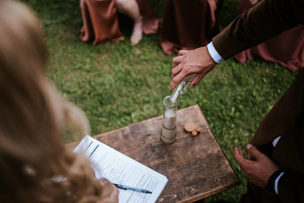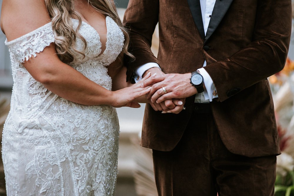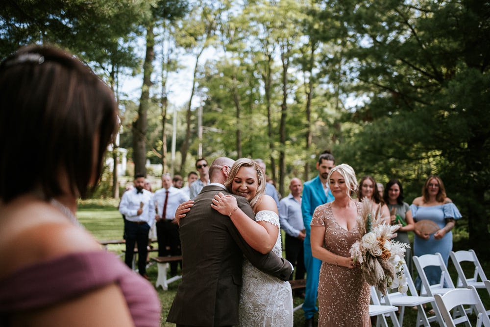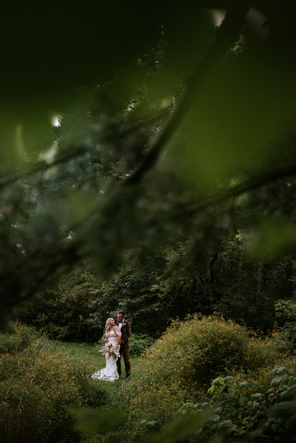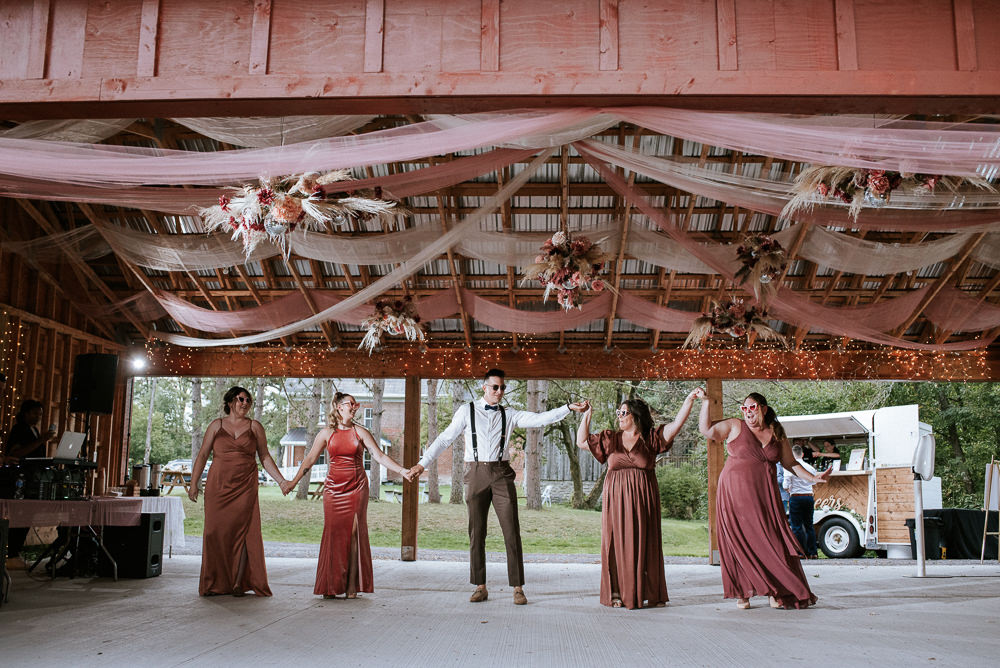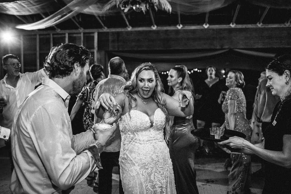 The reception was a celebration of love, laughter, and the joy of togetherness. Long wooden tables were adorned with rustic centerpieces, and fairy lights danced above, creating an enchanting ambiance. As the sun dipped below the horizon and the looking storm clouds in sight, the twinkling lights and the rustic surroundings merged to form a picture-perfect scene. It was the calm before the storm however, as the heavy clouds began to stream in.